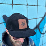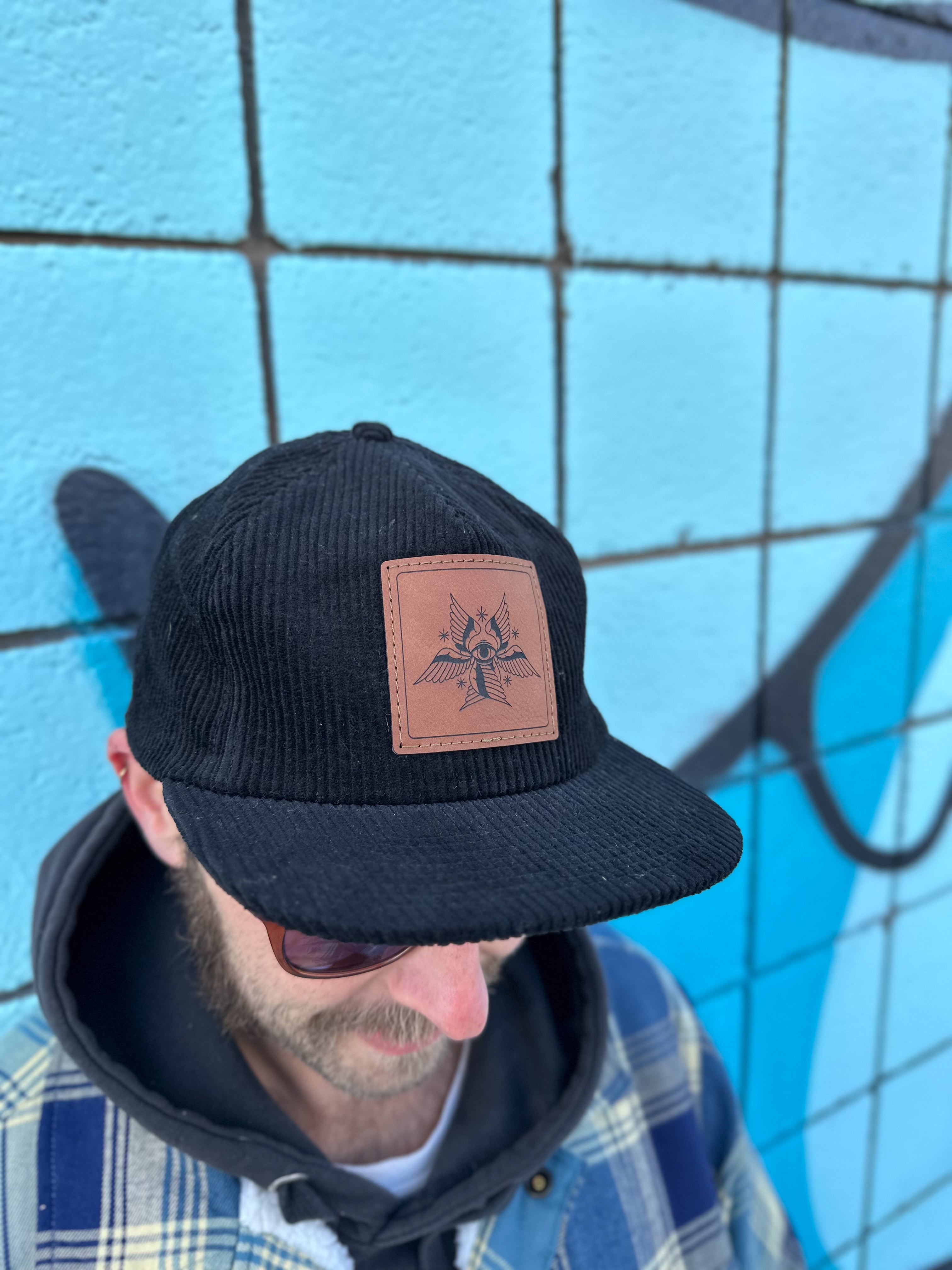 The patches are laser etched by Erik at Saber Laser. The patches are sewn on the hats by Marcelo Granados in his studio, located in Reno, Nevada.